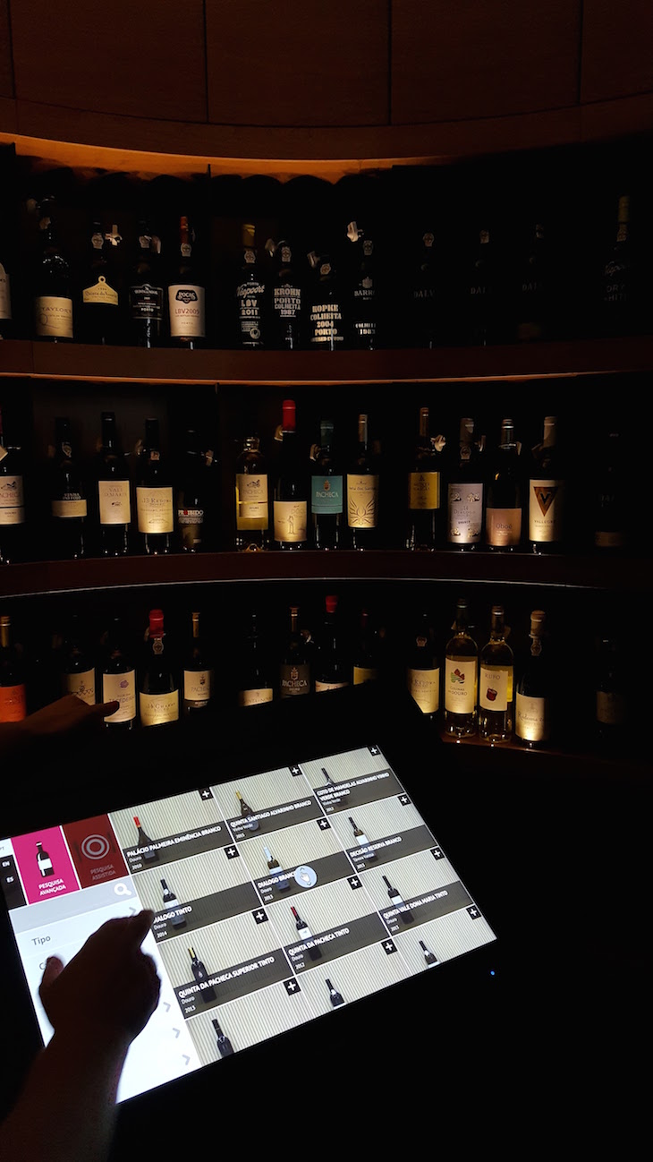 Outra sala que nos cativou muito – e nem é muito grande – foi a câmara de vinhos, ou garrafeira interativa. Através de um painel interativo escolhe o vinho que quer comprar (pode bebê-lo no espaço ou levar consigo) e uma luz apontará para o vinho que escolheu na prateleira. Há varias marcas representadas.
