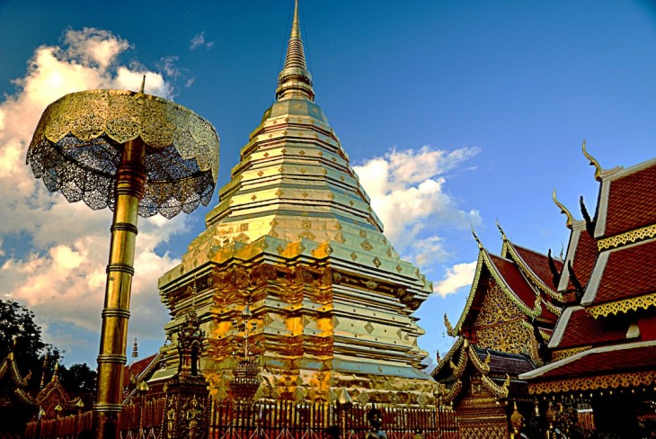 Um espaço de referência, que adorei: o templo de Doi Suthep, no cimo do monte, perto de Chiang Mai. É um templo muito visitado e é um espaço lindíssimo.