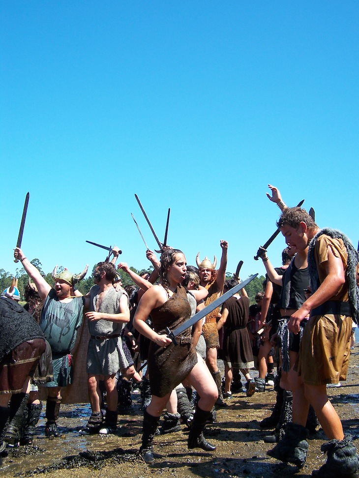 Quanto mais perto estiverem, melhor vai conseguir ouvir os gritos dos guerreiros. Empunham as espadas na mão e quando o barco está perto de terra saem, em clima de terror (parece mesmo um filme!), aos berros para cima da areia da pequena costa enquanto gritam vitória.