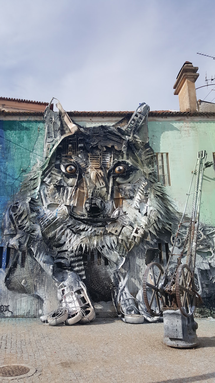 Junto da estação de comboios pode ver a obra de Bordalo Segundo, que reutiliza materiais. Na parede de um edifício está um Lobo, a partir de “lixo”. Mas há mais… fique atento à street art do Fundão