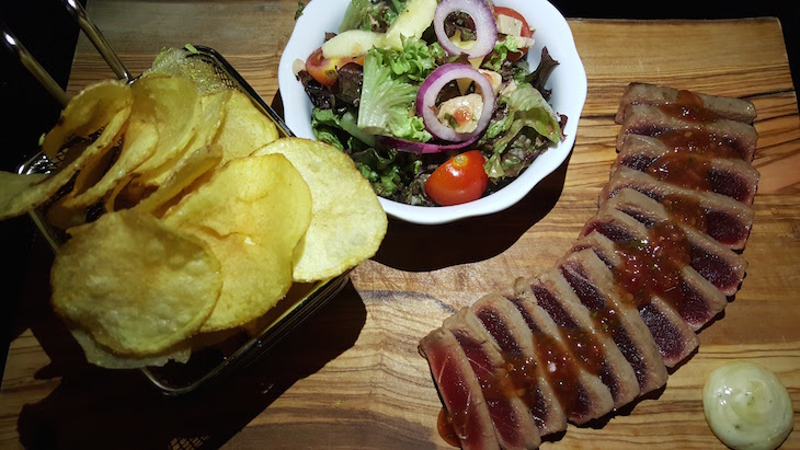 Escolhemos partilhar os (deliciosos!!) croquetes de carne com maionese de ameijoa à Bulhão Pato (7,5€), seguido por um atum braseado com sweet chili e salada de atum fumado (14€), igualmente saboroso.