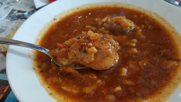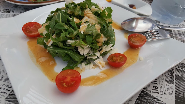 A salada de rúcula, queijo parmesão e vinagreta de torrão estava ótima, até porque para o dia quente e este era o prato ideal. Ainda assim, mesmo com calor, foi-nos servido o mais típico prato das redondezas: o gaspacho de montanha (muito parecido com o gaspacho manchego). É um prato forte – daqueles que era refeição por quem trabalhava no campo, para ter mais resistência – feito com massa, molho de tomate e pimentos, e com carnes como coelho ou frango, por exemplo.