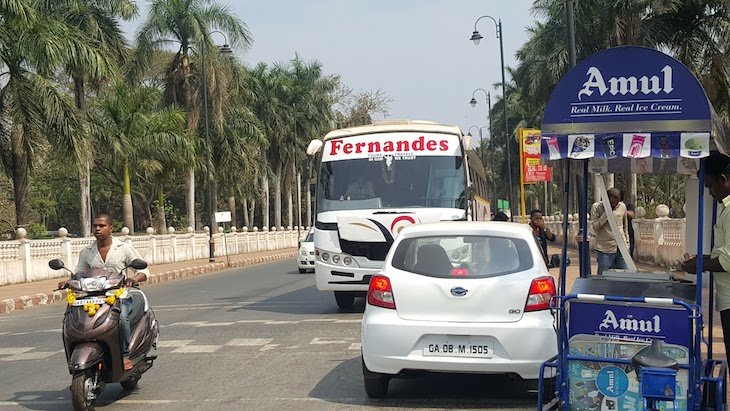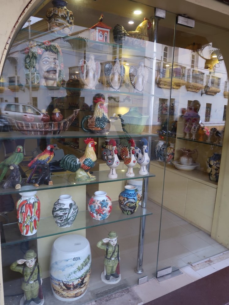 Há lojas com louça tipicamente portuguesa à venda, há galos (a lembrar o de Barcelos) em muitos locais, e encontro o bar do Dias pelo caminho e autocarros que dizem “Fernandes”. Tudo faz lembrar Portugal em Goa, excepto os casinos instalados do outro lado do rio. Porquê tão longe? “Para dissuadir as pessoas de jogarem excessivamente”, diz-nos o guia.