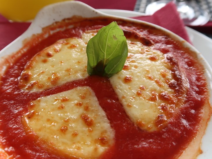 Comecemos então pelo que provei: a Provoleta (queijo provolone italiano gratinado no forno de lenha com molho de tomates italianos San Marzano), acompanhada com pão d’alho, também cozido no forno a lenha com manteiga de alho e ervas. Simplesmente divinal!