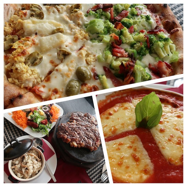 Sendo que adoro pizzas e queria experimentar as carnes, decidi provar um pouco de tudo: um T-Bone grelhado (estava delicioso e é incrível como a carne tem um sabor diferente, de cada lado do osso), acompanhado com um pequeno tacho de risotto de cogumelos e uma fresca salada (com tomate seco, presunto, cenoura, ovo cozido tomate e alface). A pizza – porque eu não conseguia decidir o que iria provar – veio com duas metades: metade com brócolos e bacon e a outra metade com frango e queijo da Serra. Para acompanhar tudo, pedi a sangria de vinho branco – que estava excelente, como toda a comida.