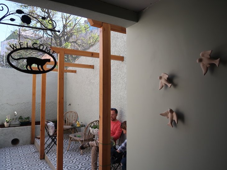 De frente para o balcão está a Cat’s Room. Uma sala envidraçada onde estão as camas dos gatos, a comida, a água, brinquedos e as suas caixas de areia, que estão escondidas, debaixo do banco corrido, à janela, com vista para a esplanada. Aí, tem dois buracos, por onde os bichanos podem sair e entrar à sua vontade e, se quiserem conviver com os clientes/visitantes.