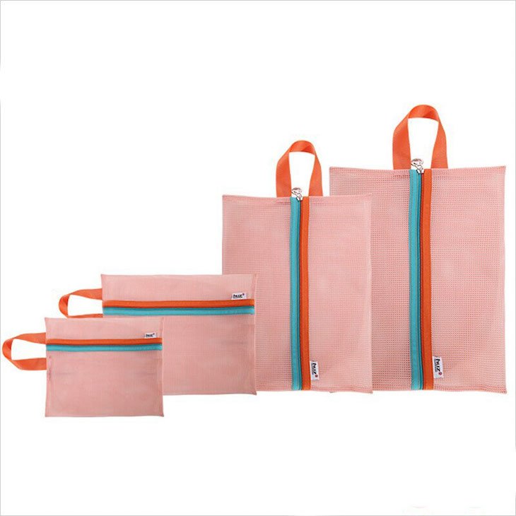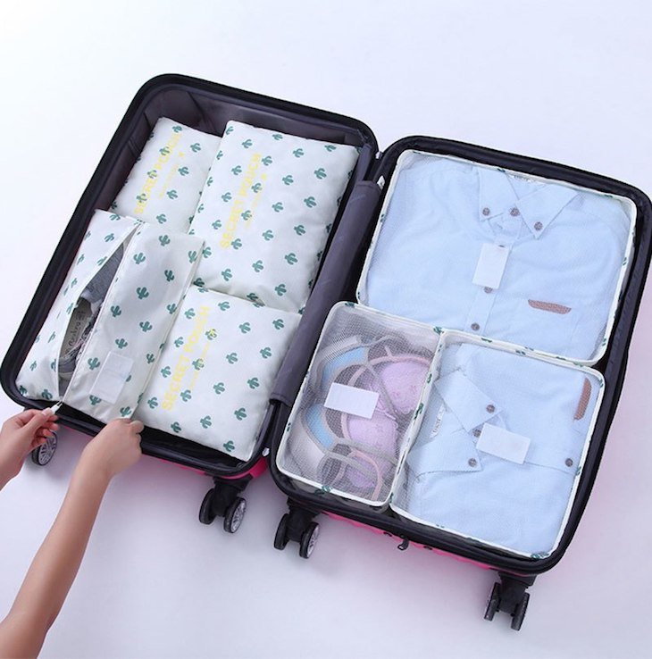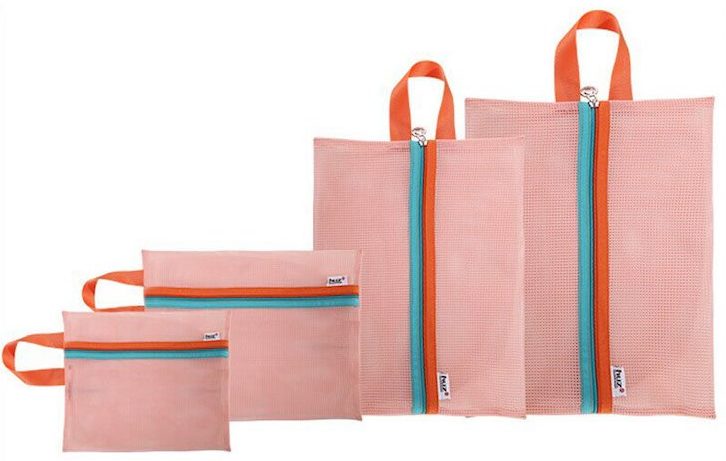 – Um conjunto de organizadores com seis ou mais peças: três que dão para manter a roupa organizada e três bolsas para dão para outros artigos, sapatos ou peças de roupa interior. Estes, da foto, são cor de rosa mas existem em várias cores. Estes também são aconselhados e dizem ser à prova de água. Poderão ter mais do que seis bolsas, acrescentando algumas com os documentos e outros artigos de viagem. Clique em cada legenda para ir ter à descrição das peças.