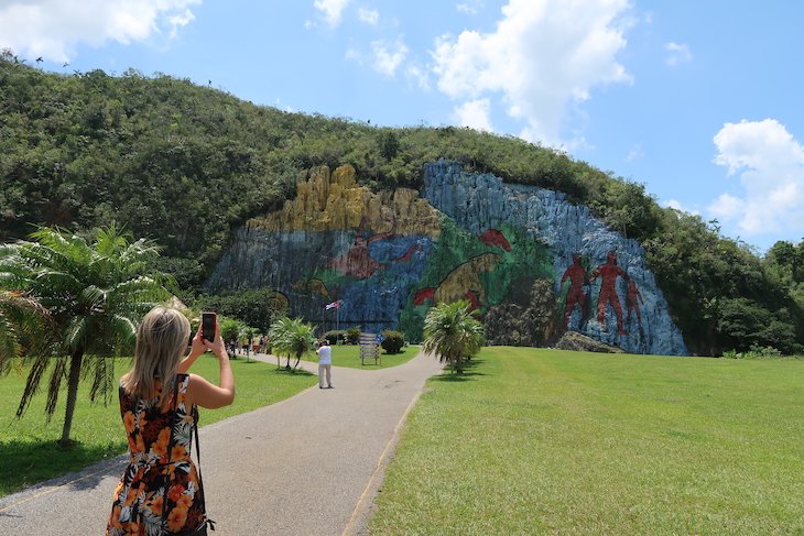 De seguida, vamos fazer o almoço junto do Mural da Pré-História (Mural de la Prehistoria), que contém umas pinturas que pretendem assinalar o facto de terem sido encontrados fósseis no vale de Pinar del Rio. O mural foi feito por artistas da terra e está situado no monte da serra de Viñales, chamado de Mogote Dos Hermanas, ocupando cerca de 120 metros. A obra começou em 1961 e demorou cerca de quatro anos a ser finalizada, sendo que representa a teoria da evolução.