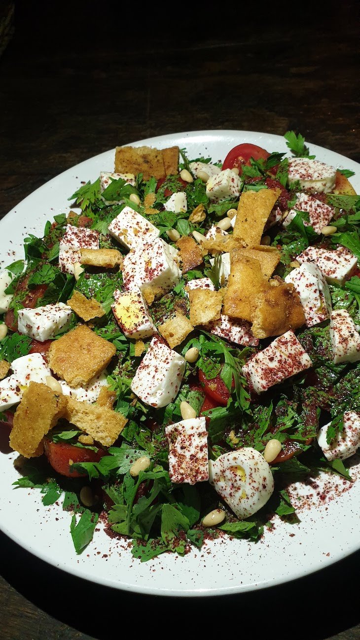 No restaurante Alreda, especialista na cozinha árabe, experimentei uma caçarola com queijo, azeitonas pretas, tomates e ameixas e também experimentei uma deliciosa e fresca salada com frutos secos e queijo feta.