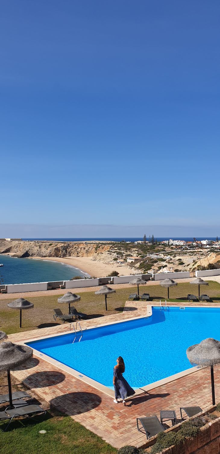 No exterior da pousada, além da esplanada – e onde também pode tomar o pequeno-almoço ao ar livre pela manhã – está a piscina, rodeada de espreguiçadeiras, com vista para as arribas, fortaleza de Sagres e praia vizinha. E por falar na vista: em dias de boa visibilidade veem-se as ilhas do Martilhal e a serra de Monchique.