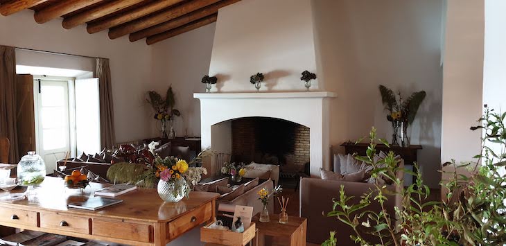 Comecei a minha visita no edifício da Country House e foi lá que todo o projeto de ecoturismo começou. Depois foram-se recuperando outros edifícios. O meu quarto, por exemplo, era um antigo pombal. Foram reaproveitadas as ruínas de alguns locais mas, de resto, tudo foi construído de novo. Tetos altos, de madeira, pintados de branco, uma cama enorme, uma sala com sofá e televisão; uma banheira luxuosa, quase vizinha da cama, candeeiros lindíssimos… tudo para nos fazer sentir bem acolhidos. A decoração conta com objetos de designer, peças de artesanato, e até as lareiras estavam preparadas para aquecerem a qualquer momento.