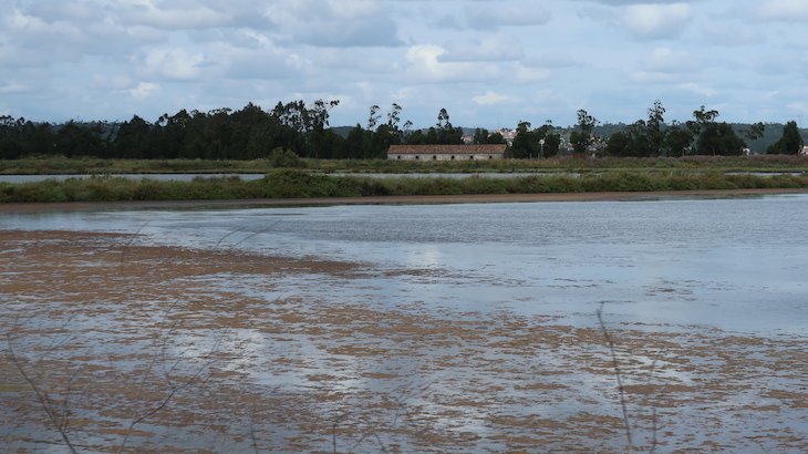 Começámos a caminhada ao lado do armazém do sal, que funciona também como museu dos utensílios que ainda hoje se usam. Percorremos os passadiços ao lado dos tanques e percebemos a vegetação que sobrevive, ao lado de tão salgado terreno, como a salicórnia, por exemplo, mas existem muitas mais plantas. Continuámos o caminho ao lado dos canais que vão levando as águas para outros campos. É aí que estão as casas de madeira onde os trabalhadores das salinas guardam o material de trabalho.