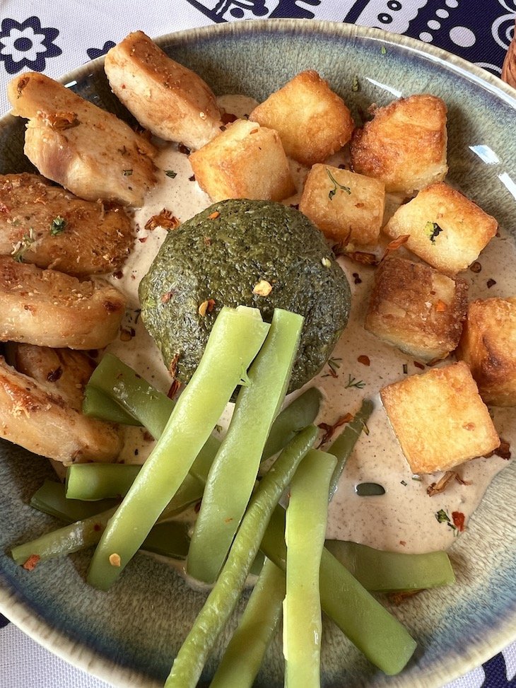 No almoço, começamos pelos patés e queijos e depois o queijo mergulhado com ovo. Segue-se uma deliciosa “espécie de sanduíche” de carne, crocante, temperada com pimenta e mel. E com a carne vem a bolinha de pesto e os quadrados fritos de uma espécie de polenta. O Khachapuri faz parte de todas as refeições na Geórgia, mas não são todos iguais… este era uma verdadeira perdição de queijo. Muito bom!