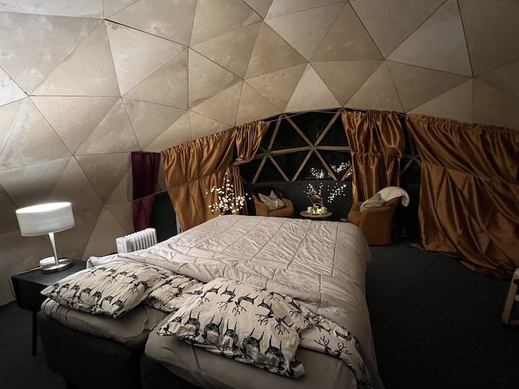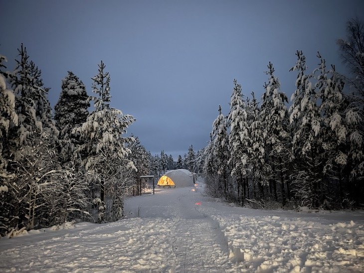 Uma nota importante sobre o dome, onde dormimos: não tem wc. Tem apenas uma sanita portátil – parecida com a que algumas autoracavanas têm – mas a casa de banho completa está a alguns metros, na casa principal. Além do chuveiro e sanita, cumprindo a tradição finlandesa, a casa de banho tem… sauna! E os hóspedes podem usar, claro! Assim, esta área é partilhada com outros hóspedes, se for o caso.