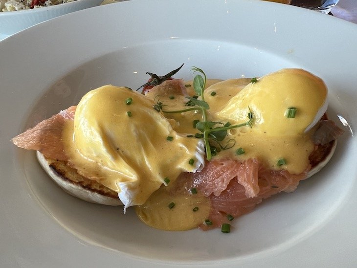 À mesa, vêm trazer os ovos e pode escolher: os Benedict com molho holandês são uma excelente aposta e pode optar por ter salmão fumado, ou com bacon e abacate. São feitos no momento e… não deixe de provar porque são mesmo ótimos!