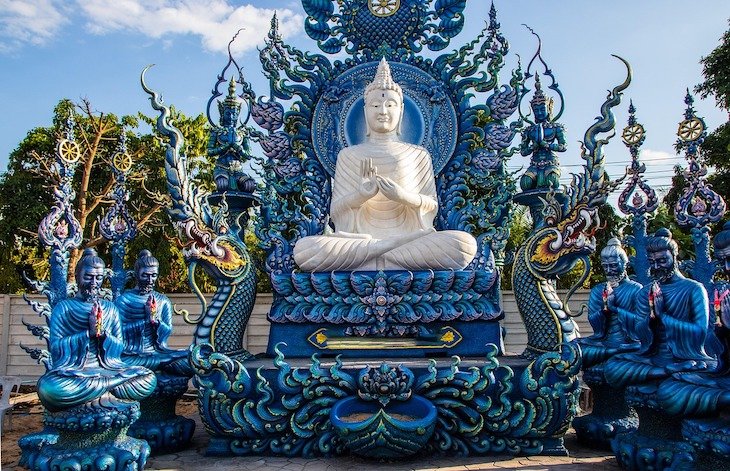 Na tradição budista, o azul está associado à serenidade e ao despertar espiritual. Essa escolha cromática transforma o templo numa experiência quase onírica, em que cada detalhe transmite calma e contemplação. Ao contrário de outros templos dourados e vermelhos, comuns no país, o Templo Azul oferece uma experiência estética rara e inovadora.