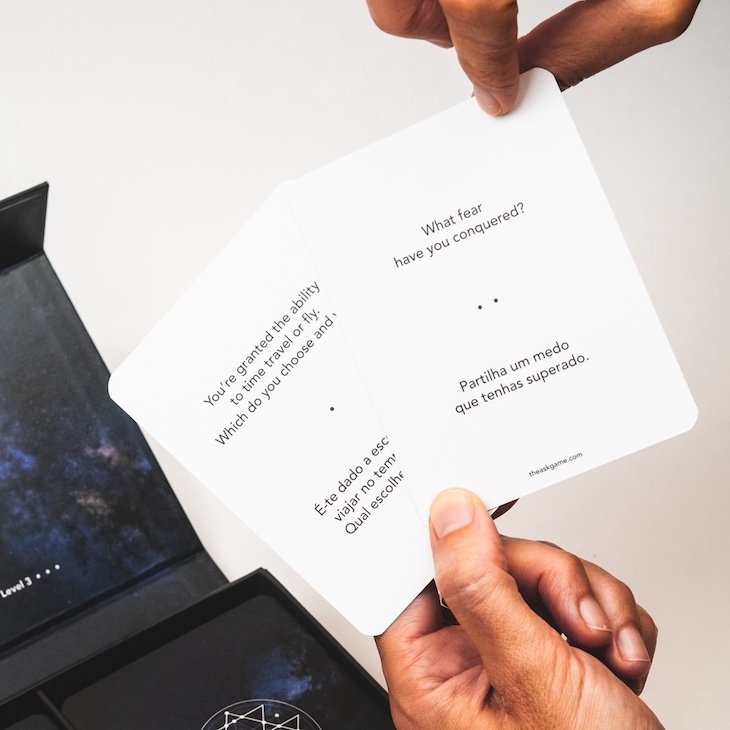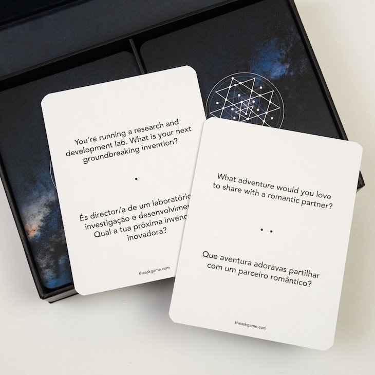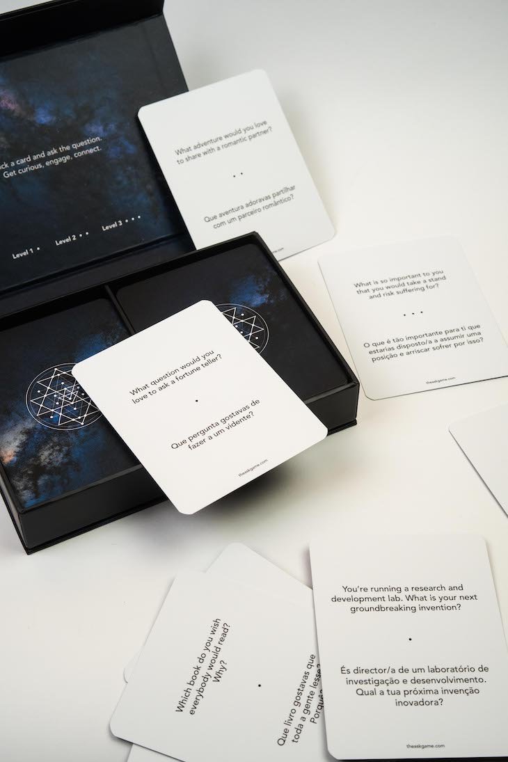 “A partir de uma base de dados com mais de 700 perguntas, criámos o ASK com 130 cuidadosamente selecionadas, divididas em três níveis de profundidade — desde perguntas leves e divertidas que quebram o gelo, até questões sobre personalidade e valores que revelam histórias além de rótulos e profissões, e por fim, perguntas que convidam à reflexão sobre a vida, o crescimento e a espiritualidade”, explicam os irmãos Filipa e Nuno Cardoso.