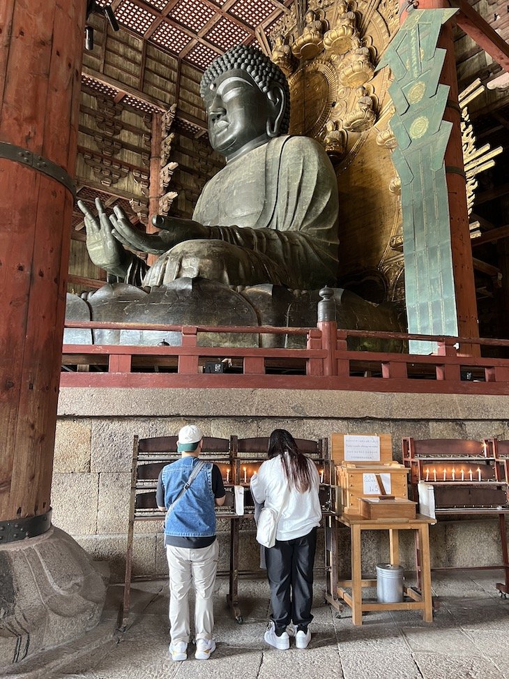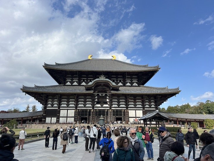 O mais impressionante é o Tōdai-ji, lar do Grande Buda de bronze — o Daibutsu — com 15 metros de altura. A estrutura que o abriga é considerada o maior templo de madeira do Mundo. Entrar no salão principal é sentir a grandiosidade espiritual do budismo japonês.