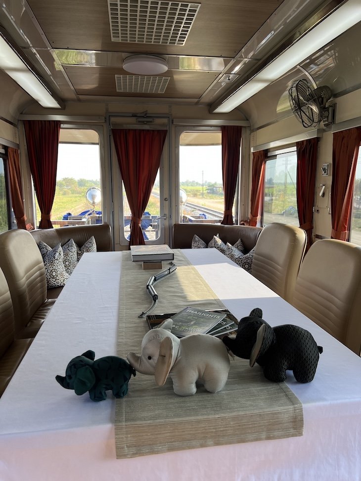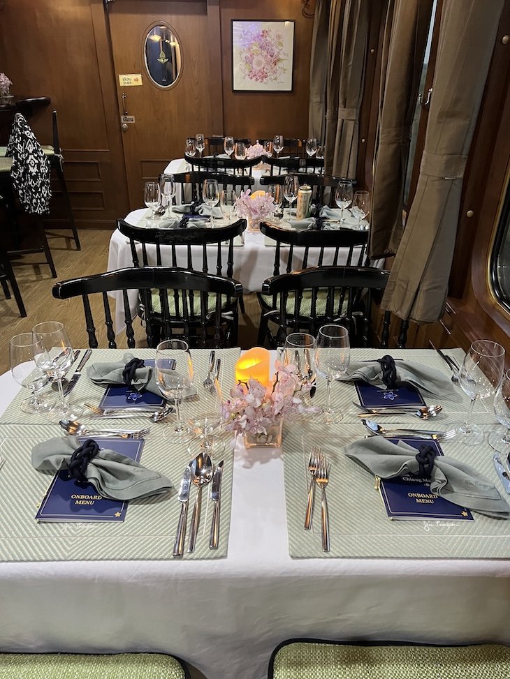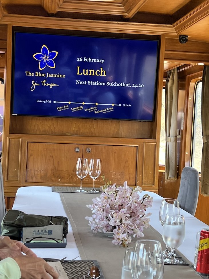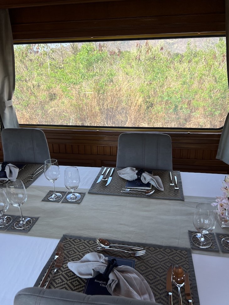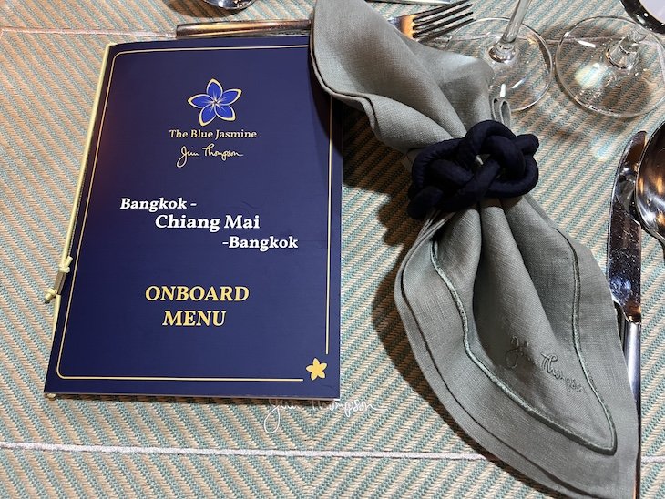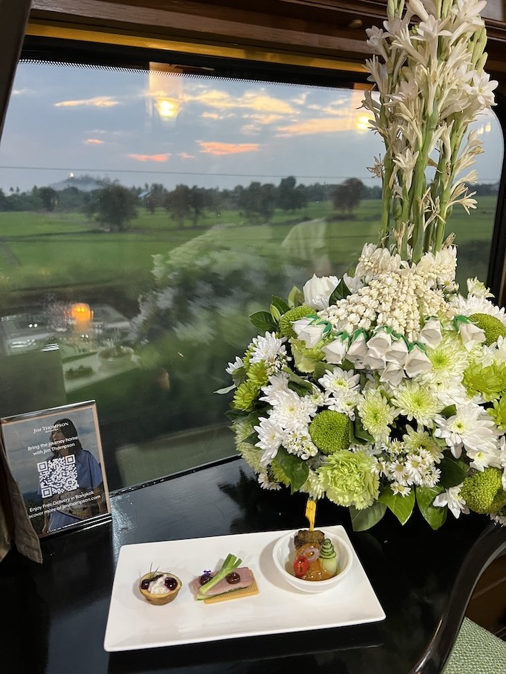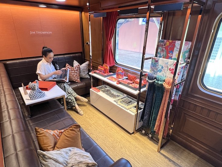 O jantar de boas-vindas decorre no espaço da casa, num ambiente onde a ligação a Jim Thompson vai além da história: os lenços, tecidos, guardanapos, individuais e almofadas usados nos espaços de jantar e lounge remetem para a estética e cores da marca. A bordo do comboio, há também uma pequena loja Jim Thompson que oferece produtos de seda e artigos inspirados na herança da marca.