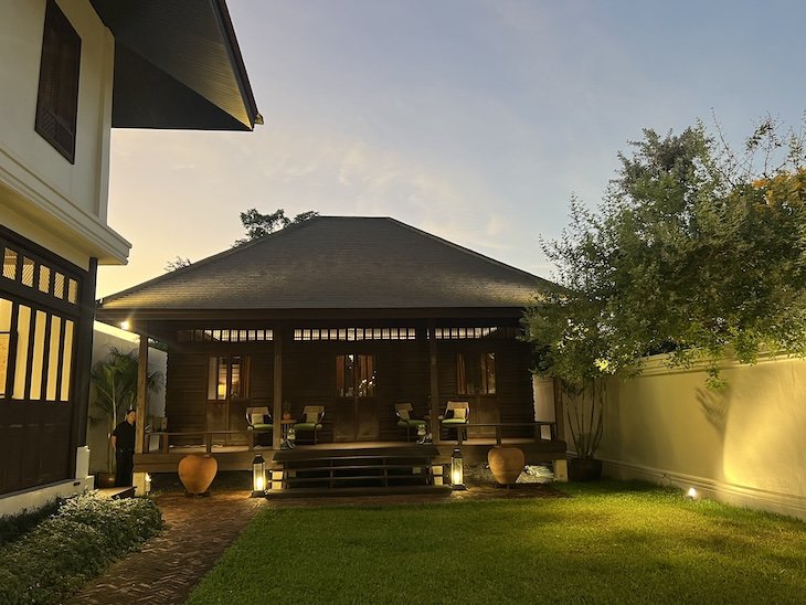 O resultado é um conjunto impressionante de pavilhões interligados em madeira, representativos do estilo clássico da Tailândia central. Elevada sobre estacas e envolvida por jardins tropicais exuberantes, a propriedade expressa a harmonia entre natureza e arquitectura que caracteriza as casas patrimoniais tailandesas. A brisa suave do rio, a iluminação delicada e a atmosfera serena criam o cenário perfeito para a última noite desta viagem — um encerramento elegante e profundamente evocador.