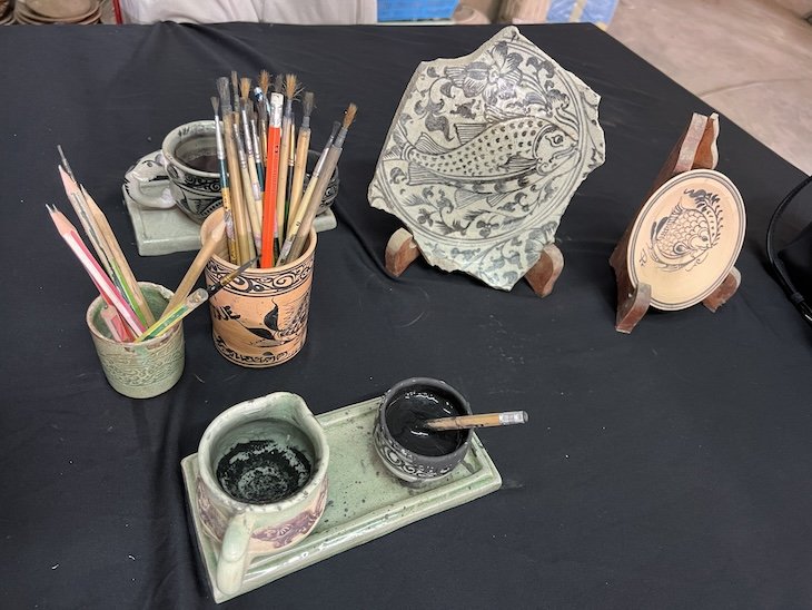 A experiência continua com um workshop prático de cerâmica. Aqui, tivemos a oportunidade de pintar e desenhar o nosso prato, entrando em contacto directo com uma técnica ancestral que tornou esta região amplamente reconhecida ao longo dos séculos. Entre os séculos XIII e XV, a área de Si Satchanalai desenvolveu-se como um dos principais centros de comércio e artesanato, beneficiando da abundância de argilas de elevada qualidade e de minerais essenciais à produção.