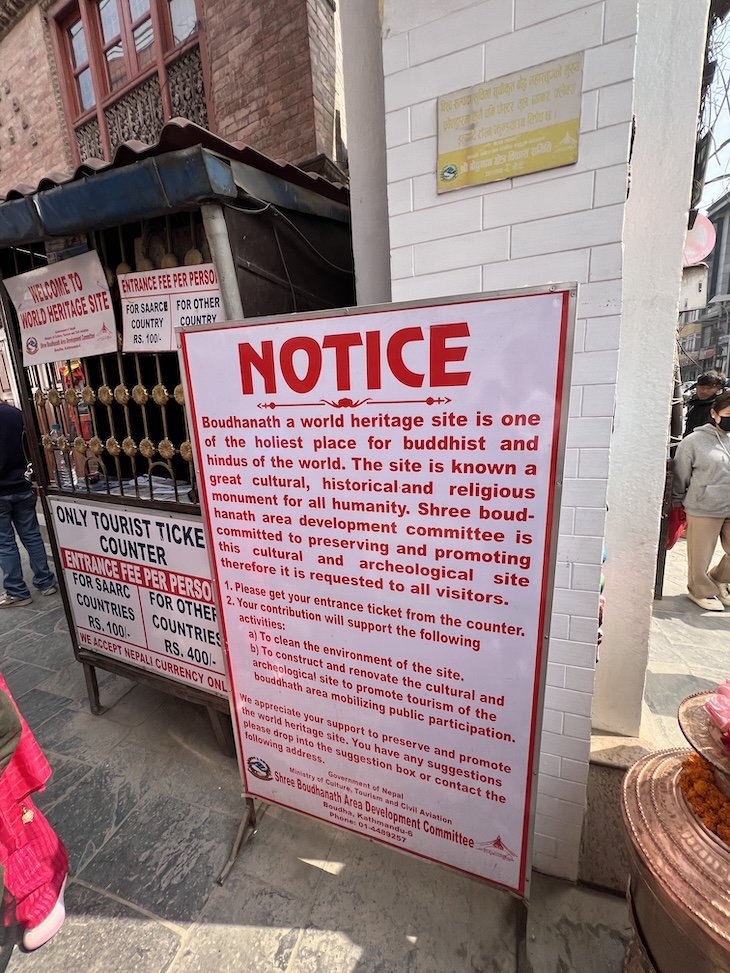 Existe uma taxa de entrada para visitantes estrangeiros, prática comum em locais patrimoniais no Nepal.