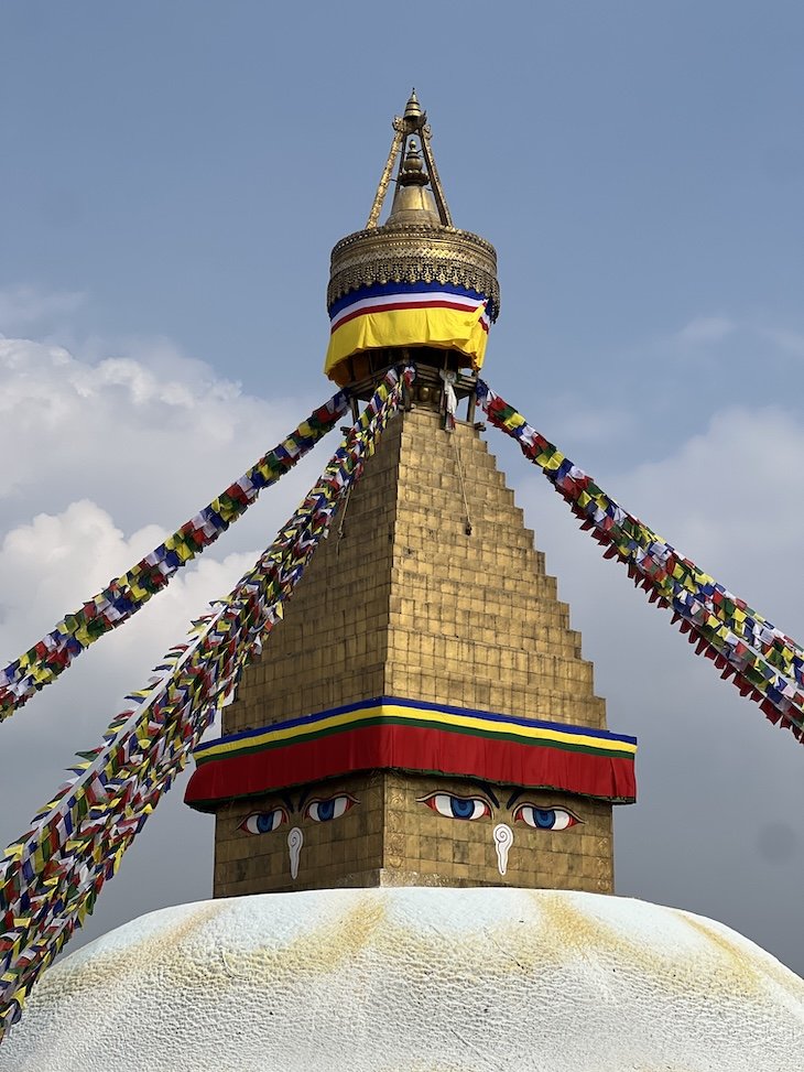 Os icónicos “olhos de Buda” estão pintados nos quatro lados da torre, simbolizando vigilância e sabedoria. Entre eles encontra-se um símbolo que representa o número “1” em escrita devanágari, associado à unidade.