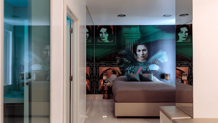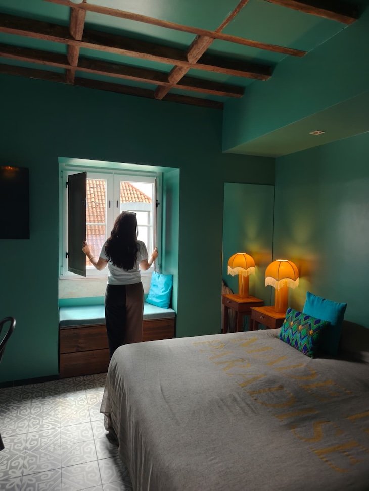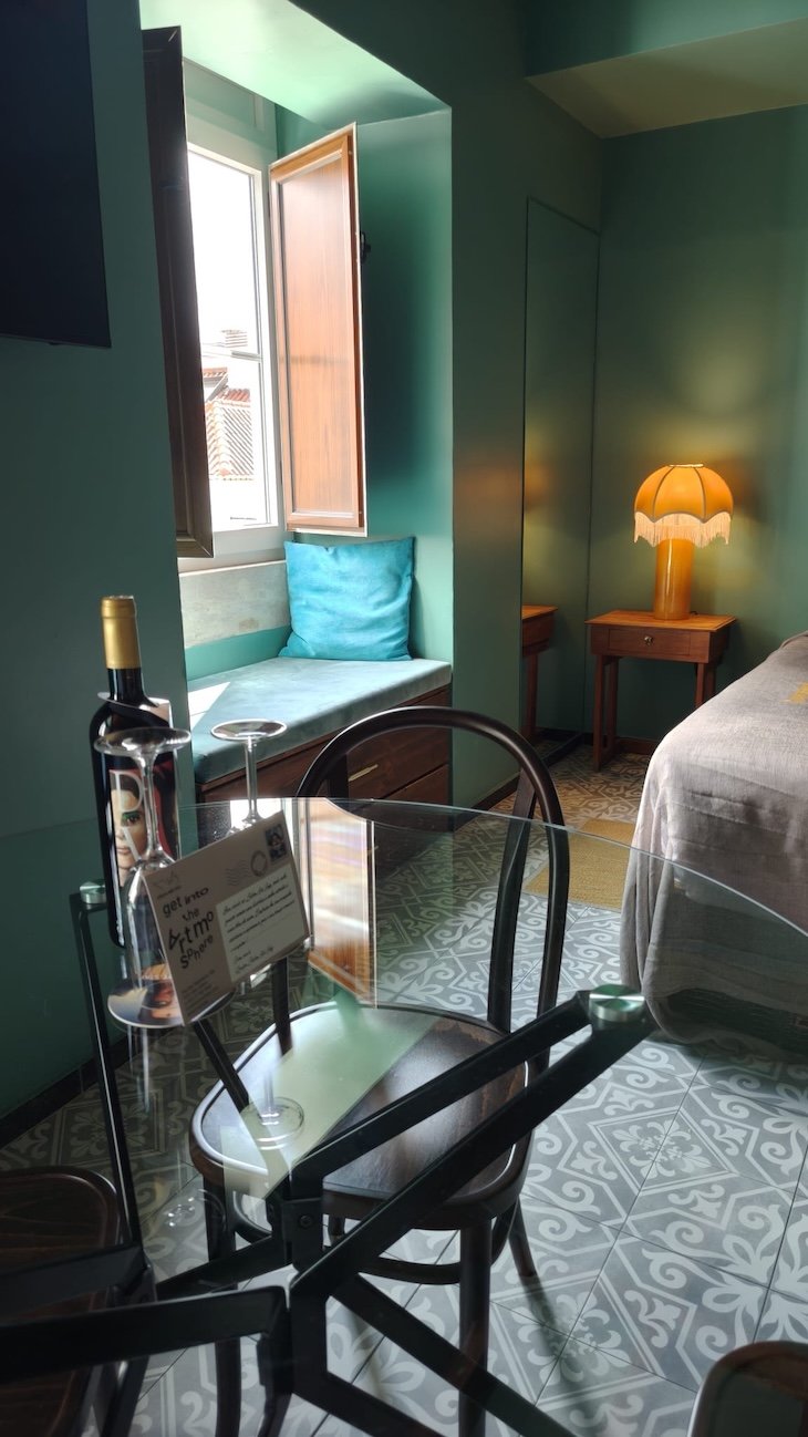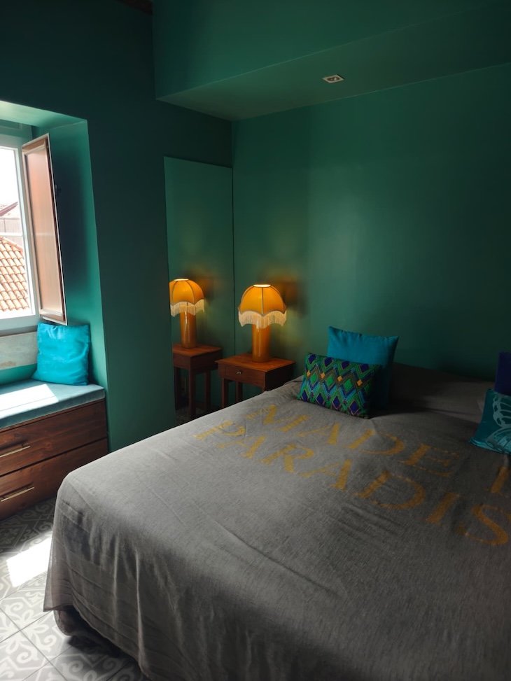 No interior dos quartos, a lógica mantém-se. Cada unidade tem identidade própria, com combinações cromáticas arrojadas, pormenores decorativos inesperados e uma atenção particular à iluminação.