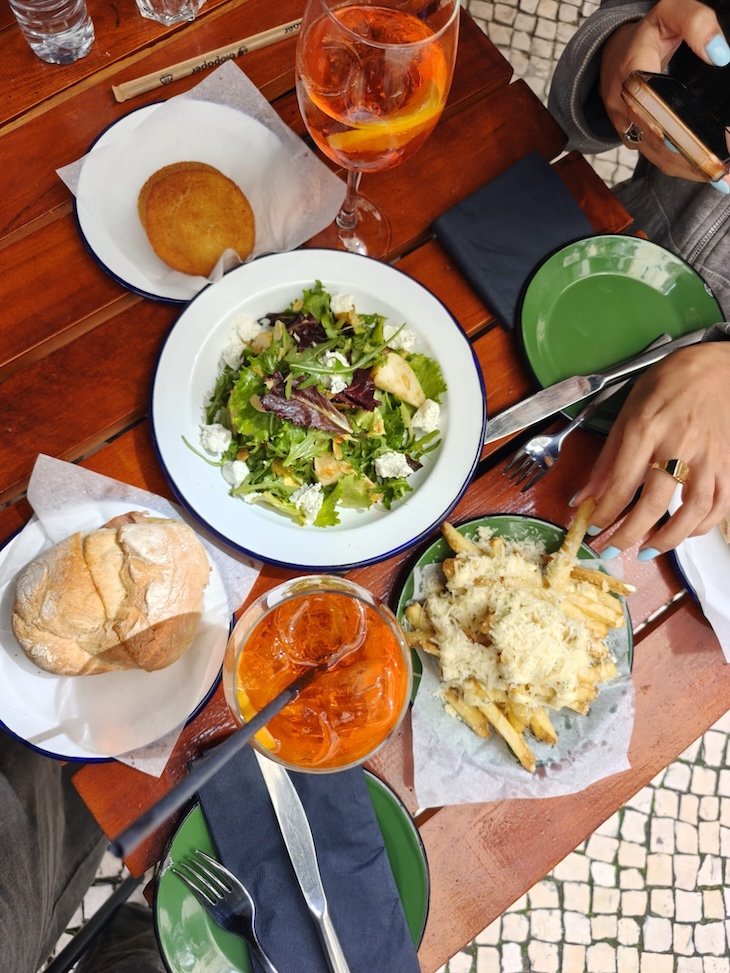 Nós pedimos umas batatas fritas com parmesão para partilhar e os rissóis de cogumelos. Tudo delicioso. Não resistimos às Bifanas do Afonso, que fazem os lisboetas – e todos os outros visitantes que fazem fila desde 1975 – muito felizes.