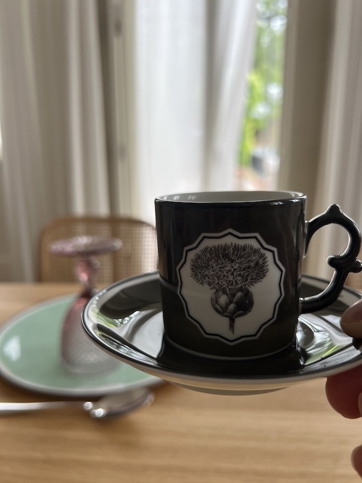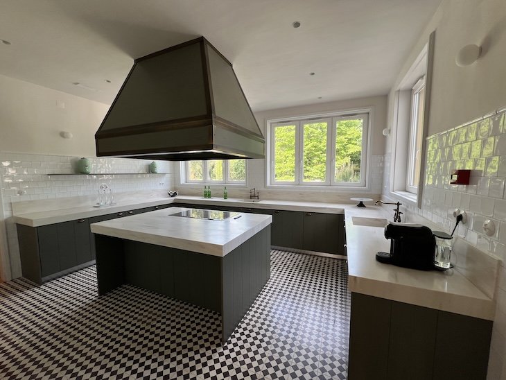 Pela casa, encontram-se várias cortesias, como garrafas de água, cafés e chás, disponíveis tanto na cozinha como nas salas. E depois há um detalhe impossível de ignorar: a loiça! Sendo este o universo da Vista Alegre, tudo ganha outra dimensão. Nesta moradia em particular, a coleção utilizada resulta de uma colaboração com Christian Lacroix. Escusado será dizer que as peças são visualmente marcantes e que transformam qualquer refeição numa experiência estética. Desde os pratos, aos marcadores de mesa, canecas e chávenas de chá ou café… são tudo peças lindíssimas!
