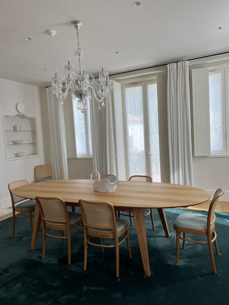 A sala de jantar tem uma mesa de madeira, com cadeiras de vime, o que dão um contraste do tradicional com o ambiente luxuoso que as peças de porcelana e o grande lustre imprimem ao espaço. Foi fantástico fazer lá as refeições. E com saída direta dessa sala está um alpendre com sofás, para relaxar e até apanhar os raios de sol no jardim.