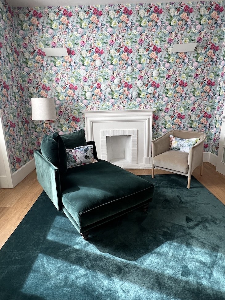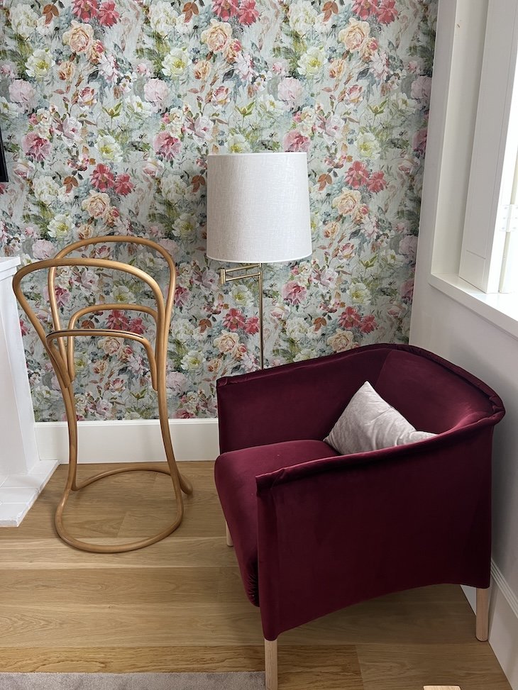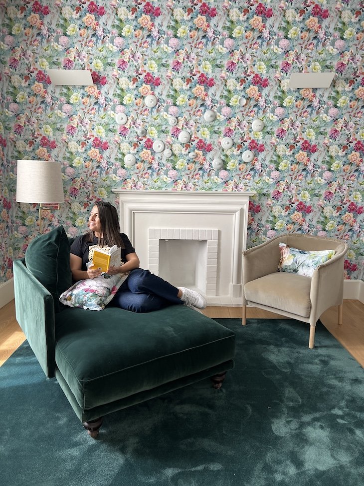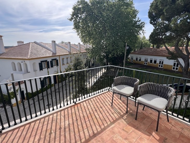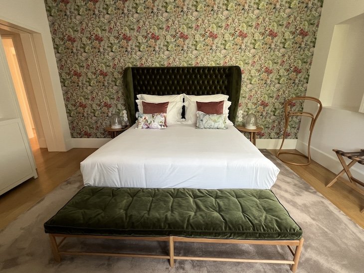 Cada quarto tem uma identidade própria e isso é algo que marca a experiência. Há um quarto em tons verdes, mais sereno; outro em tons bordeaux, mais envolvente; e um terceiro, maior, com padrões florais e acesso a uma varanda com uma vista aberta sobre a rua principal e as casinhas do empreendimento.